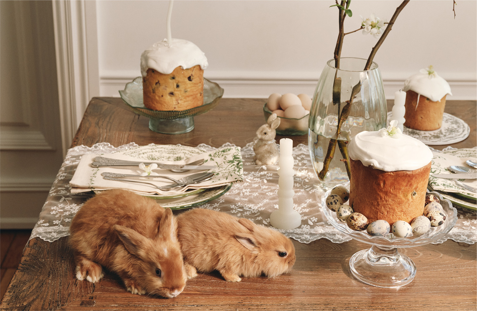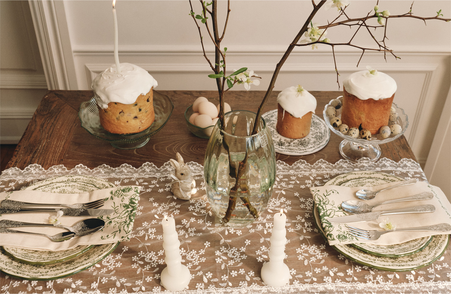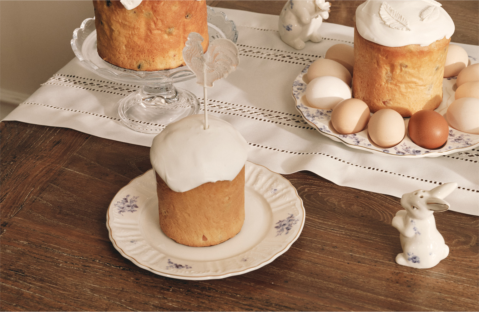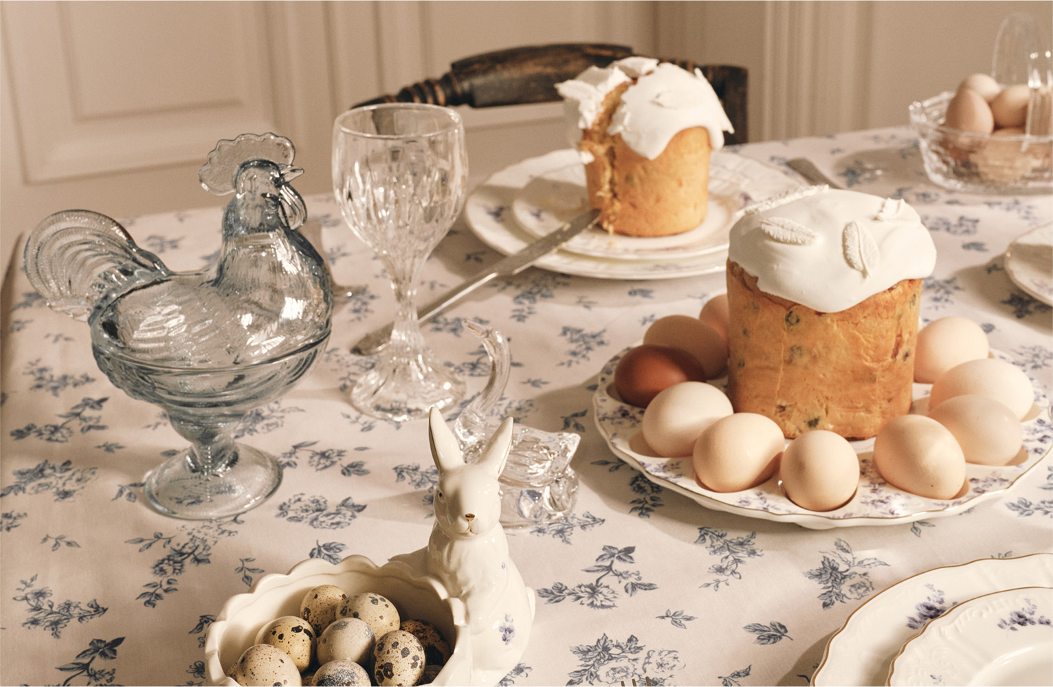 Фарфор с изящным цветочным узором, полупрозрачное стекло и белые подносы для яиц и куличей создадут особое настроение.