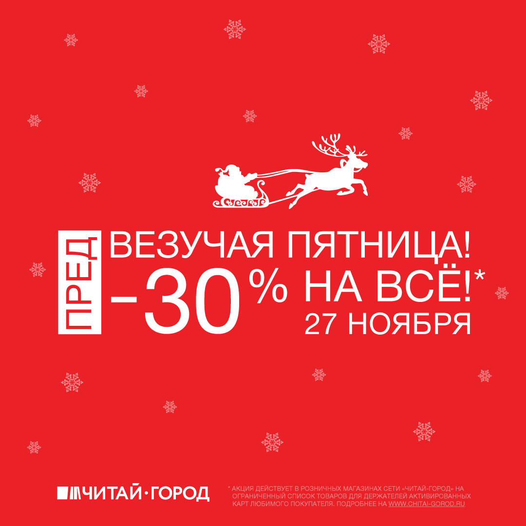 Только для держателей Карты Любимого Покупателя в «Читай-городе» пройдёт закрытая акция «ПредВезучая пятница». 27 ноября в магазинах сети будет действовать скидка 30% на всё*. Успейте порадовать себя и своих близких новыми книгами, игрушками, канцелярией и милыми сувенирами :)