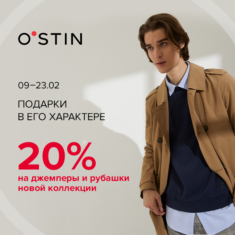Скидка 20% на джемперы и рубашки новой коллекции для мужчин.