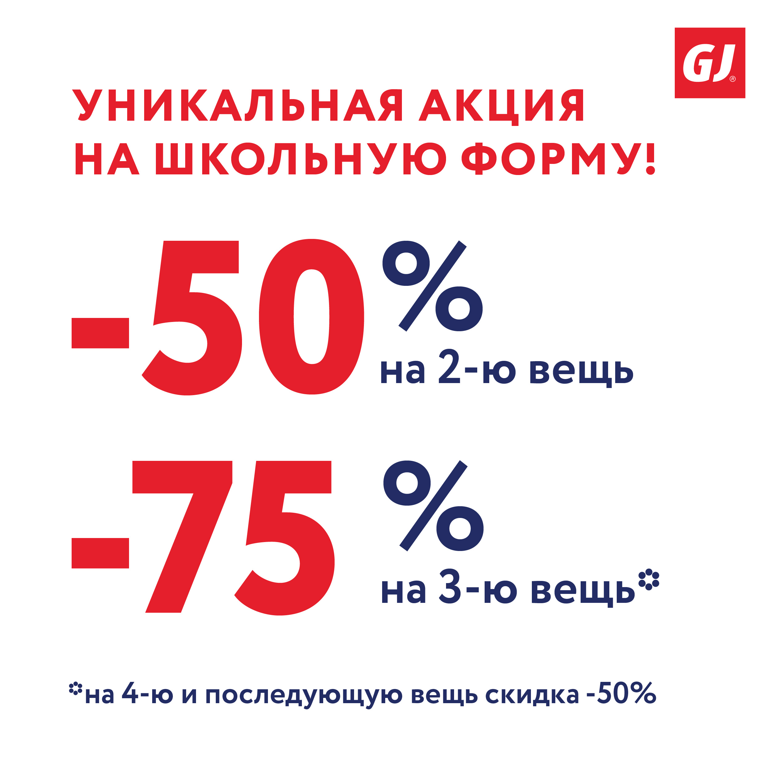 Скидка -50% на вторую вещь в чеке школьной формы, 75% на третью вещь, скидка на четвертую и последующие вещи школьной формы в чеке -50% . Больше покупаешь, больше экономишь! Подробности уточняйте у продавцов-консультантов.