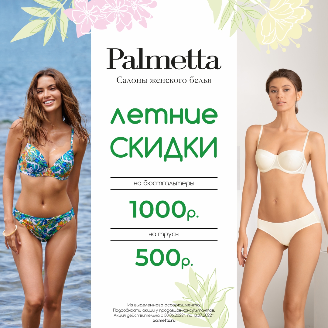 Яркое летнее предложение в Palmetta: дарим скидки 1000 рублей на бюстгальтеры и 500 рублей на трусы из коллекций белья и купальников.